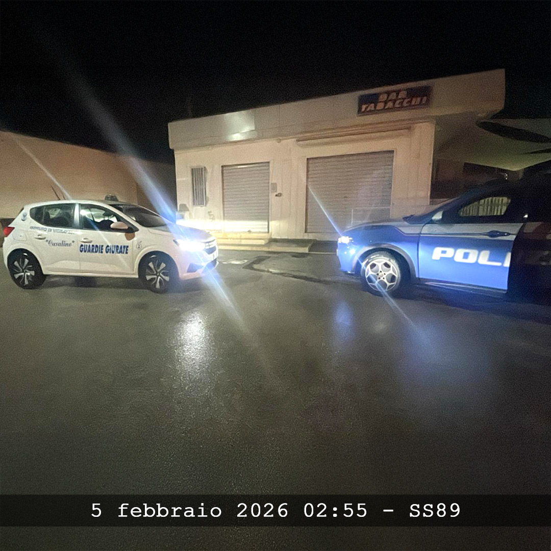 Poco dopo, alle ore 02:55 circa del 5 febbraio 2026, la Centrale Operativa della vigilanza Casalino è stata contattata dal Commissariato di Polizia di Manfredonia, che segnalava la presenza di persone all’interno dell’area di un distributore IP, situato lungo la Strada Statale 89, di fronte alla Basilica di Siponto.